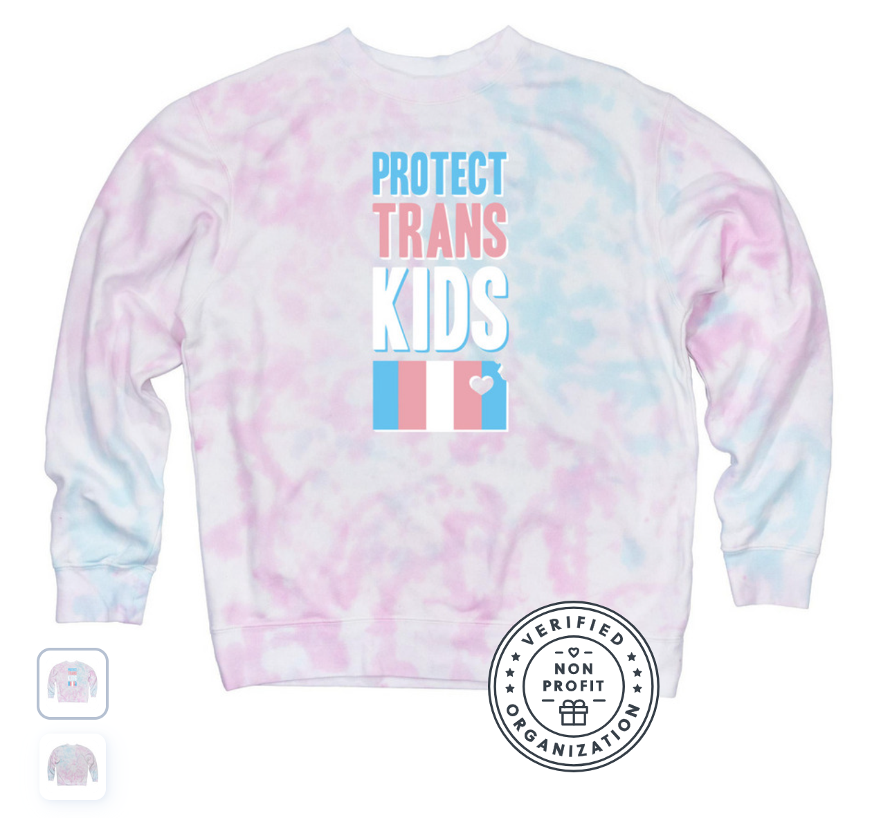 Tye-died unisex crewneck sweatshirt with the words “Protect Trans Kids” and an image of Kansas with the colors of the trans pride flag.